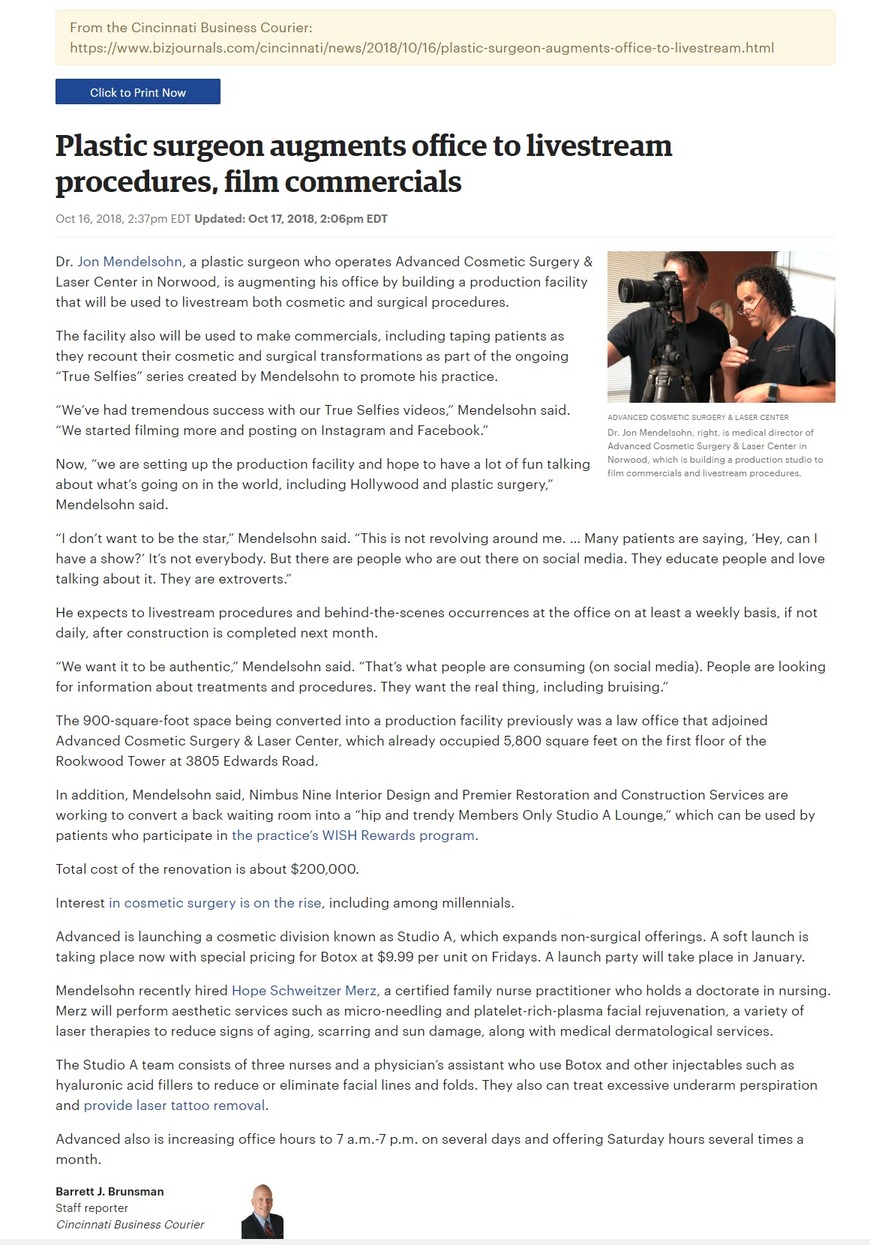 Plastic surgeon augments office to livestream procedures.